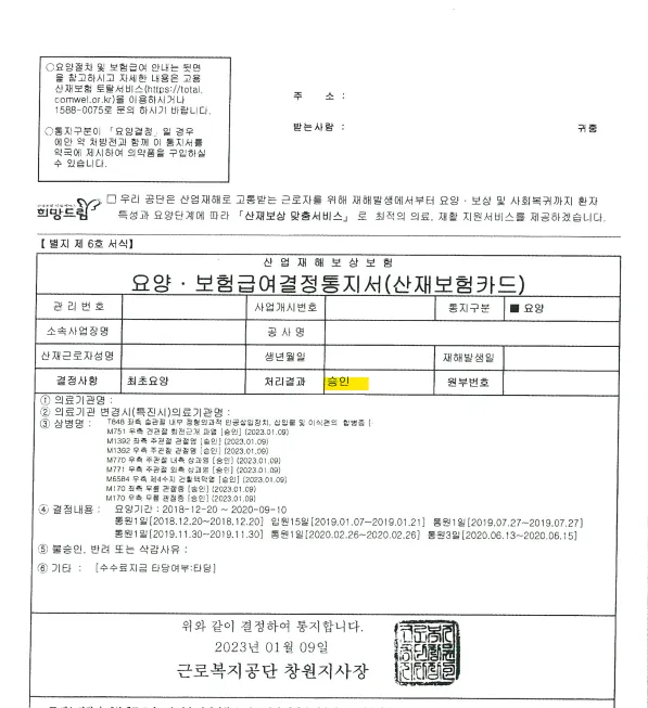 행정소송을 제기하여 진료기록감정신청을 통해 상병과 업무 사이의 상당인과관계를 입증하였고, 28년간 현장에서 근무한 작업 이력과 무릎에 부담을 준 작업자세 등을 입증하여 조정권고를 통해 산재승인